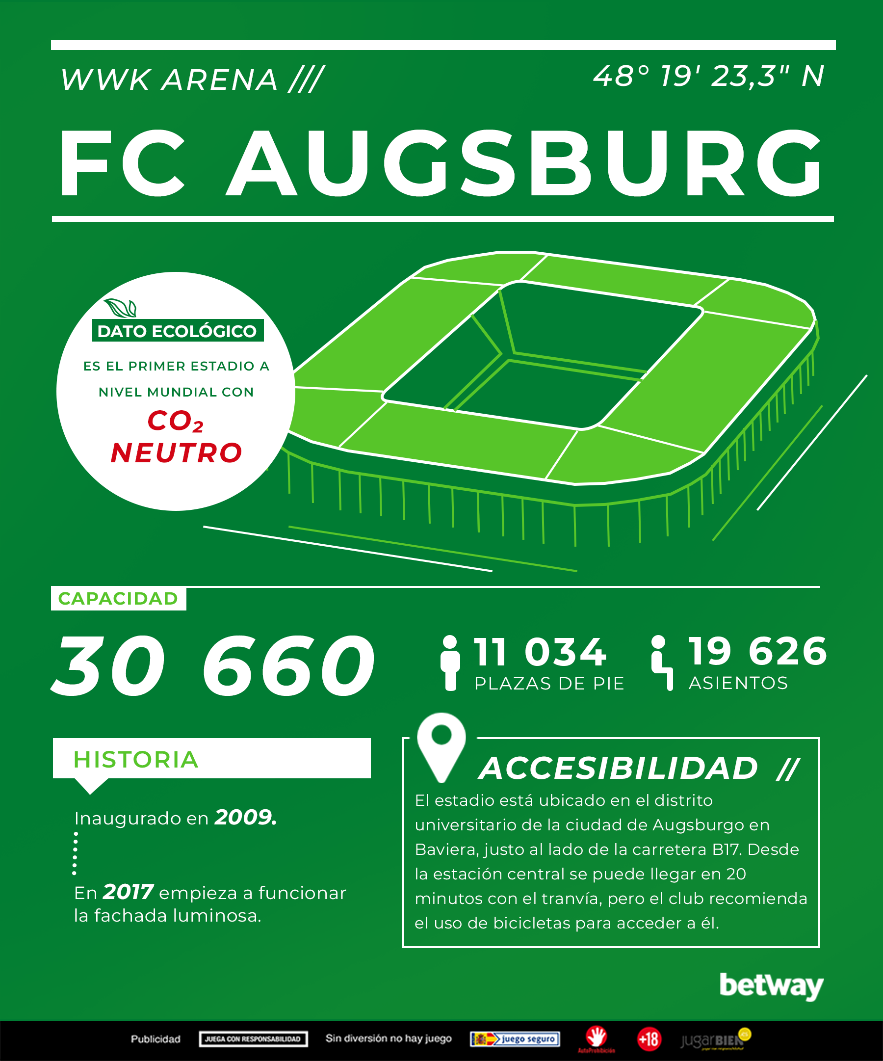 El estadio del Augsburg es el primer estadio a nivel mundial con CO₂ neutro, esto se debe especialmente a las dos bombas de calor que aprovechan la energía geotérmica de la superficie y componen el núcleo del sistema energético. De esta manera se alimenta la calefacción de los palcos y áreas VIP, así como los vestidores y las oficinas, además de que alcanza para cubrir el funcionamiento de la calefacción del campo. Gracias a estas medidas que no impactan el clima, se ahorran más de 750 toneladas de CO₂ al año. Todo esto le mereció al estadio el reconocimiento a través de la iniciativa “Alemania – País de las ideas”, en 2011.