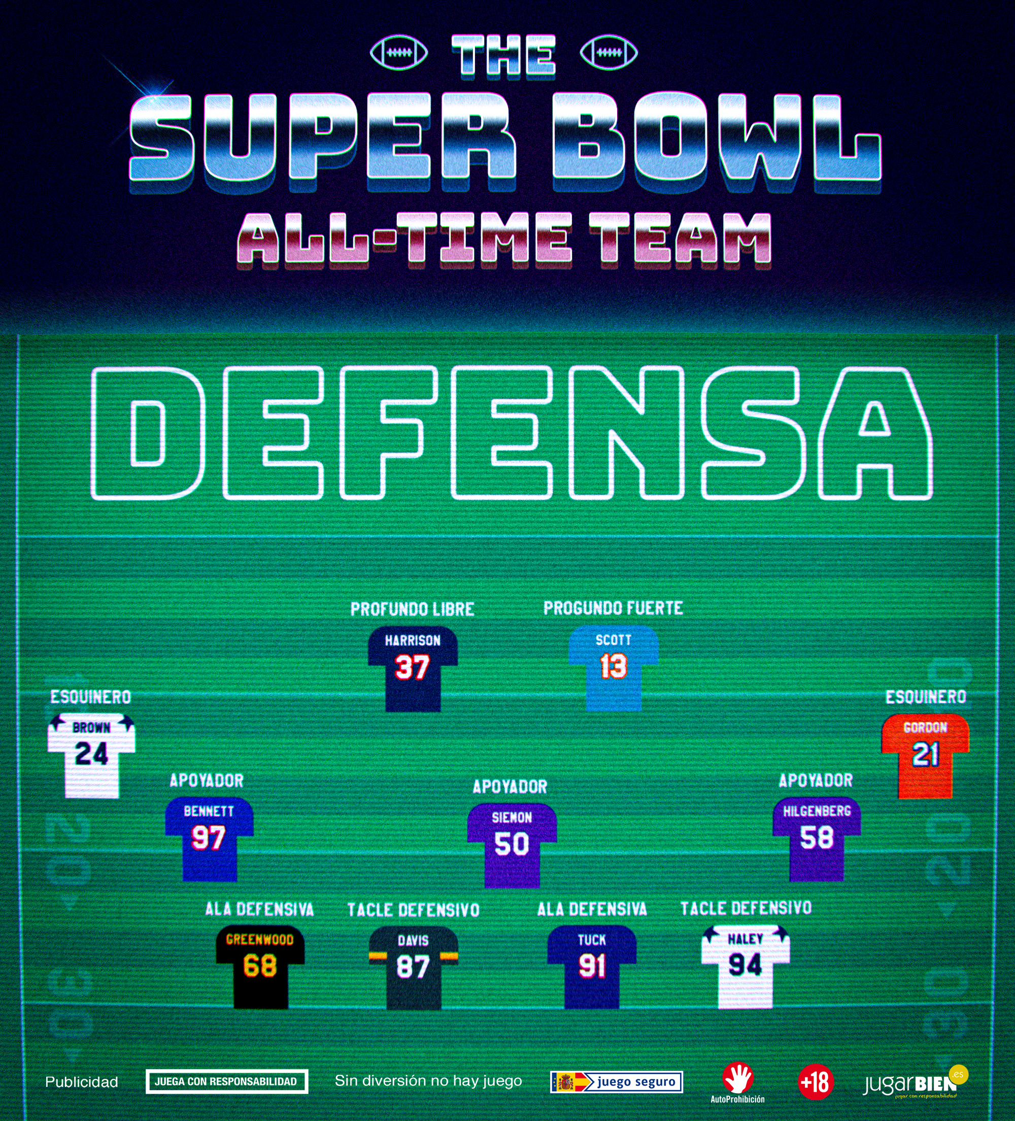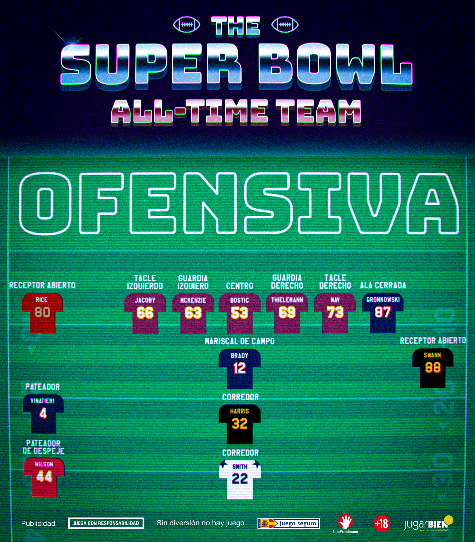 Ahora que falta poco para la Super Bowl de este año, que se celebrará en la Bahía de Tampa (Florida), hemos creado un equipo con los mejores jugadores de la historia de la Super Bowl (según las estadísticas).