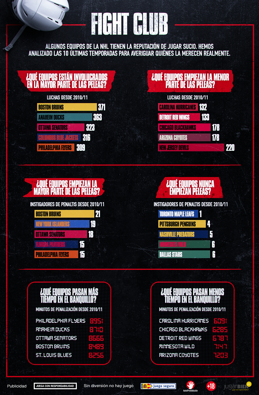 En el polo opuesto, los Carolina Hurricanes son el equipo que participa en menos peleas, con solo 132 peleas graves desde la temporada 2010/11.