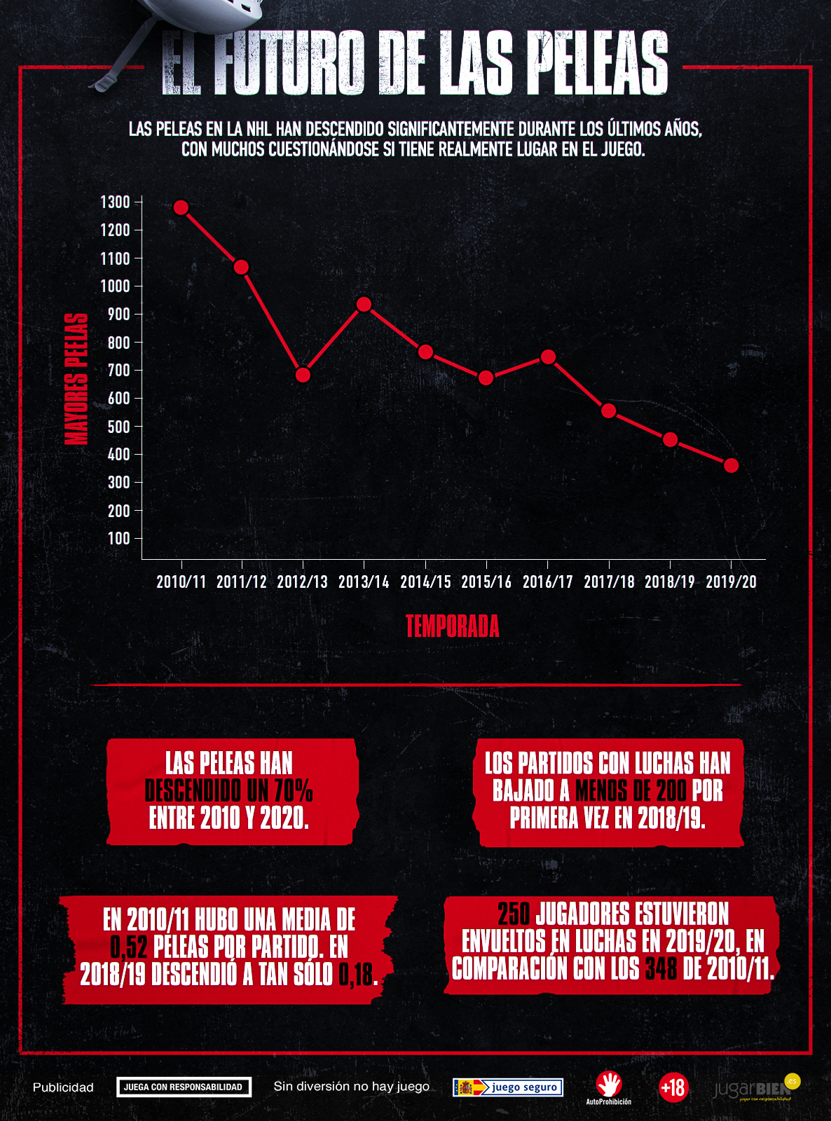 En general, en la NHL las peleas han disminuido un 70 % en los últimos 10 años, y las peleas graves han pasado de 1274 en la temporada 2010/11 a solo 388 en la temporada 2019/20.